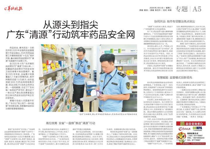 自2025年4月广东开展药品经营环节“清源”行动以来,一场覆盖药品经营环节的安全保卫战在南粤大地全面铺开。截至2025年年底,全省累计检查覆盖5.7万家次零售药店,其中网售药店超1.9万家次;动态监测超3000万药品网络销售页面;依法注销215名执业药师注册。一组组数据,见证了广东对每一粒药的严苛守护,更见证了一条从生产源头到消费者指尖的立体化药品安全防护网正在织密筑牢。