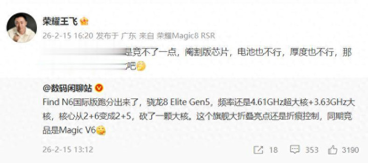 看到了吗?岂论是OPPO Find N6如故荣耀Magic V6都莫得驱动认真预热,然而一经不错看到炸药味了。目下对于OPPO Find N6的音问不是好多,只知说念中枢解决器以及以折痕小为卖点。但荣耀Magic V6的音问就好多了,因为这款机型将会在MWC2026年认真发布,外洋媒体的邀请函一经发出了。目下应该正在拍宣传版,因为有行业东说念主士曝光了谢霆锋手抓荣耀Magic V6的像片,且据好多大V讲他们一经收到了该机,仅仅目下还在逃匿阶段不成认真对外公布辛勤。把柄此前的信息荣耀Magic V6的内置电板高达7000毫安以上,且浮薄过程再创行业记载。