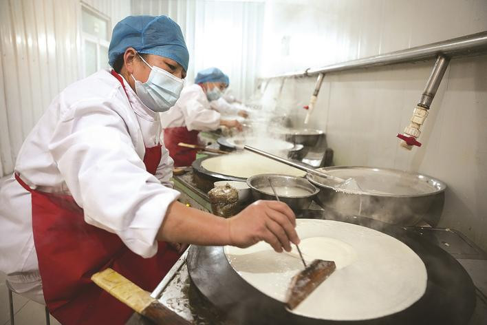 每天清晨7时,董会房的素叠子加工坊内,鏊子上摊煎饼的“滋滋”声、蒸笼冒出的团团白气、此起彼伏的劳作声,奏响了作坊晨曲。董会房的素叠子加工坊从选料到加工,每一步都认认真真。质量第一,是他坚守多年的准则,也是他对顾客、对祖辈手艺的承诺。