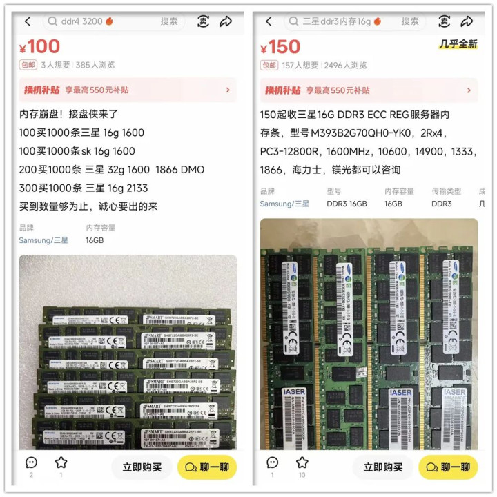 有东说念主抛售当然就有东说念主链接,我还在闲鱼看到多半“接盘侠”开的回收帖。比如有东说念主以1000条为回收单元,三星16G内存不错给到100元/根,三星32G内存不错给到200元/根,如若是2133MHz频率的能给到300元/根。还有东说念主非凡收ECC/REG工作器内存条,三星16G DDR3不错给到150元/根。