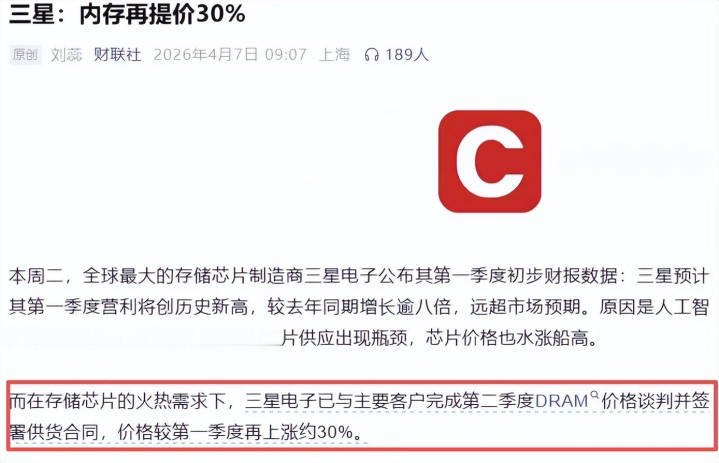 至于为啥非要收三星的内存条?我猜跟昨天财联社发布的一篇题为《三星:内存再提价30%》的著作酌量,三星内存第三季度的供货价钱相较第一季度高潮30%,既然上游全新还要加价,那么卑劣二手也能止跌。