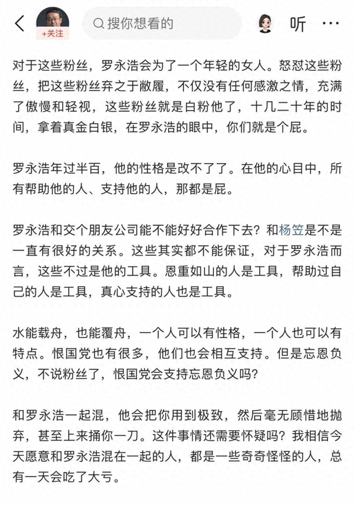 2026年4月初,项立刚写了一篇长文,说罗永浩没文化、莫得俞敏洪赞理的话即是街边混混,还平直说他负义忘恩,这件事不是倏得发生的,之前罗永浩公开支撑杨笠,说她讲的是男性心焦,效果被好多东说念主月旦,说他带节拍,项立刚就借这个契机拿起2012年的事,那技艺俞敏洪投了几百万给罗永浩作念锤子手机。