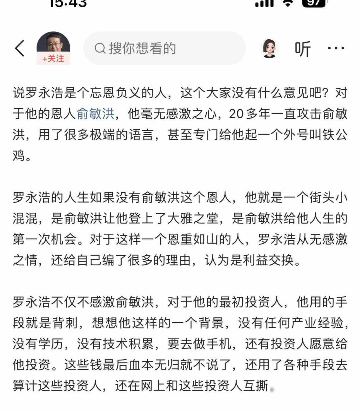 罗永浩照实用过俞敏洪的钱,也承认这笔钱帮了他大忙,其后锤子没作念起来,他欠了六亿债,靠我方直播三年还清了,这靠的是直播间里那三千万粉丝风物下单买东西,不是靠谁再给他赞助,项立刚说他不懂感德,可营业迎阿底本即是彼此需要的事,谈不上谁要记取谁一辈子,投资东说念主出钱图的所以后能赚转头,不是思收个犬子。