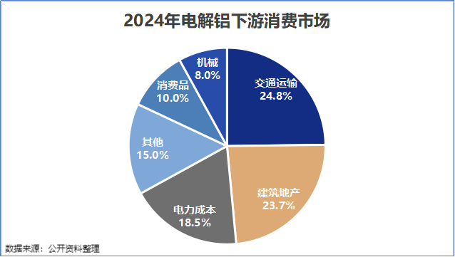电解铝需求的前三大行业差别为交通输送、房地产、电力。其中,交通输送对铝材的需求量占比达24.8%,建筑地产占比23.7%,电力畛域占比18.5%。