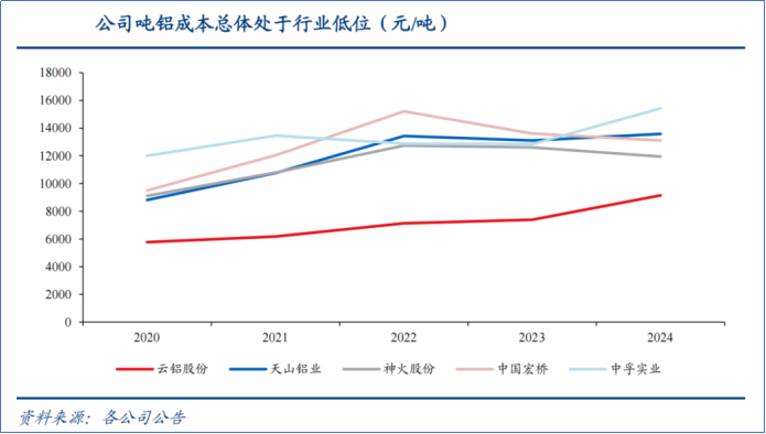 收获于原材料部分自供以及云南水电资源,2020-2024年,公司的吨铝老本光显低于同业业其他公司。
