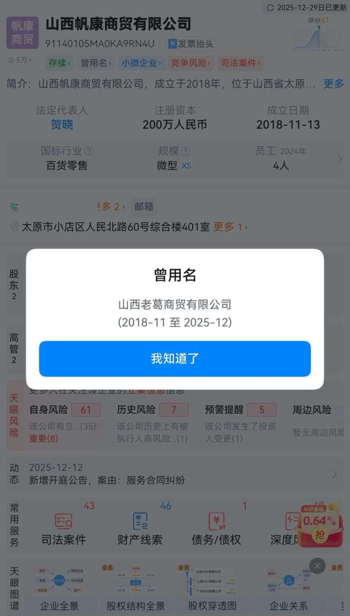 山西老葛商贸有限公司刚更名为山西帆康商贸有限公司(图源:天眼查)