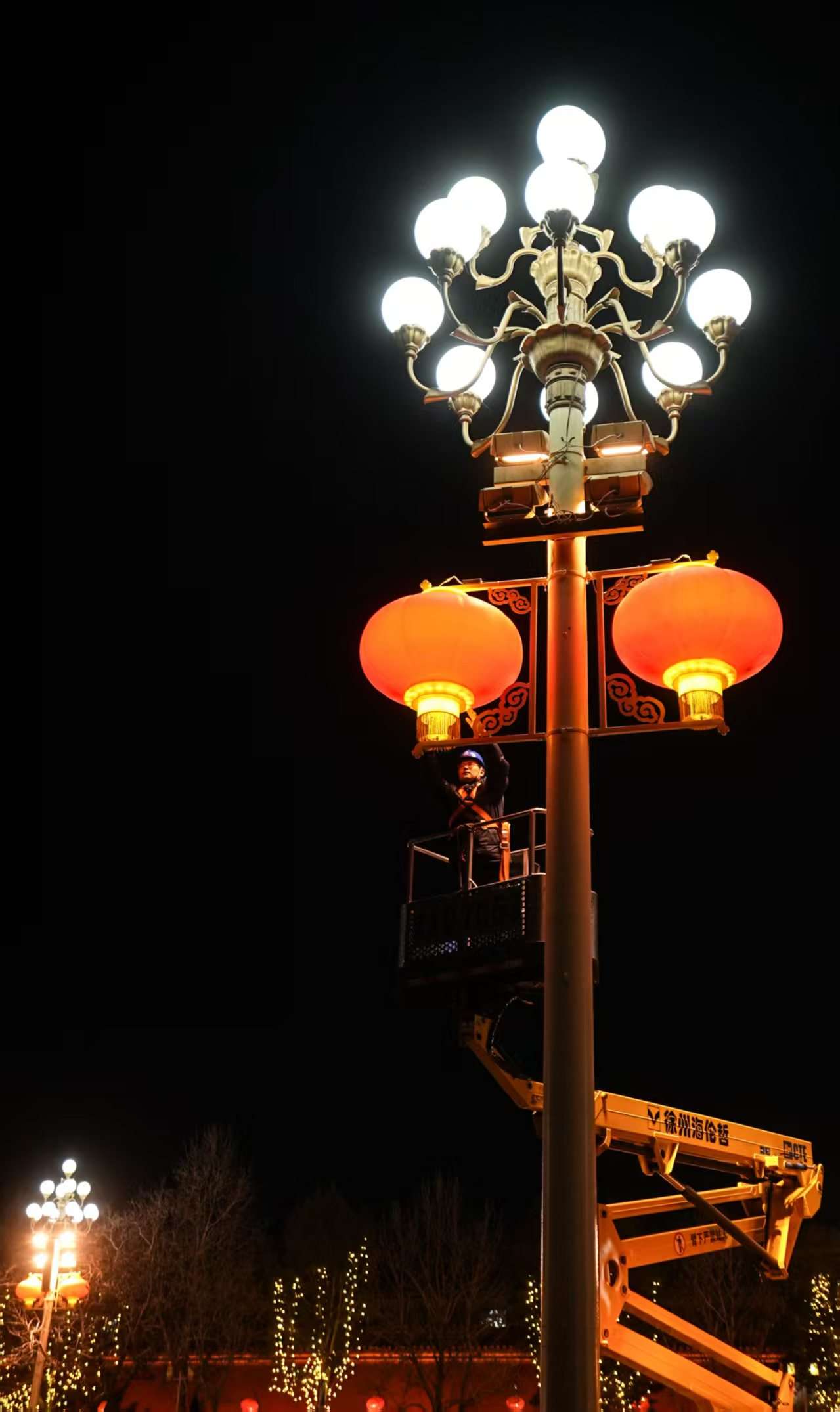 2月6日晚,长安街沿线春节景观灯饰进入“春节模式”,国网北京电力城市照明管理中心工作人员在西长安街调试大红灯笼。(魏晓彬/摄)