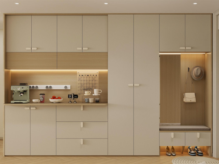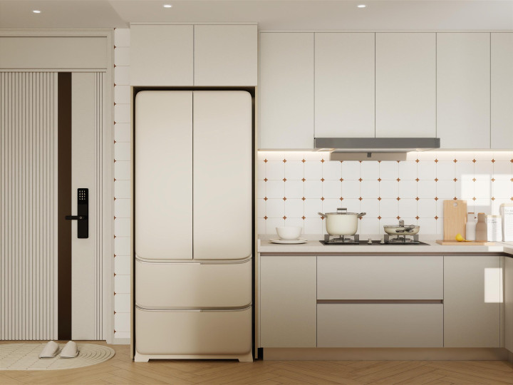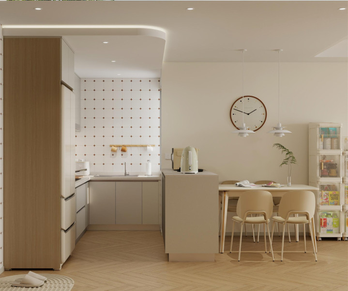 厨房买通缱绻成敞开式厨房、岛台连通餐桌增多储物空间
