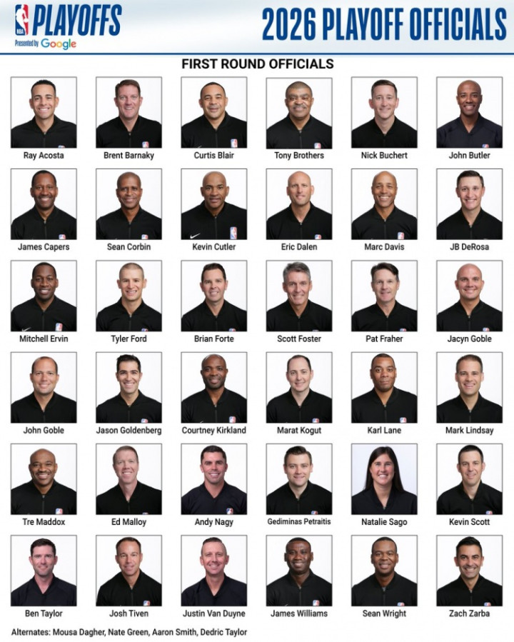 直播吧4月14日讯本日NBA官方公布了本年季后赛首轮的裁判36东谈主大名单(包括附加赛),名哨福斯特领衔。